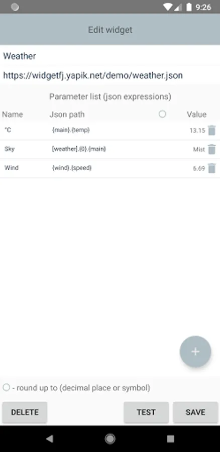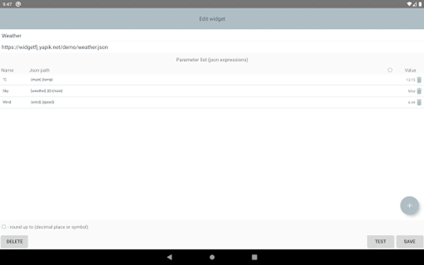 To make the application work, it is enough to add the url-address, json-path (description below or in the screenshot), press test and after successful verification - save. All added entries will be available for adding to the home screen as widgets.