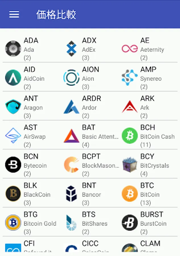 通貨ごとに各取引所の価格を取得し、比較表示します。