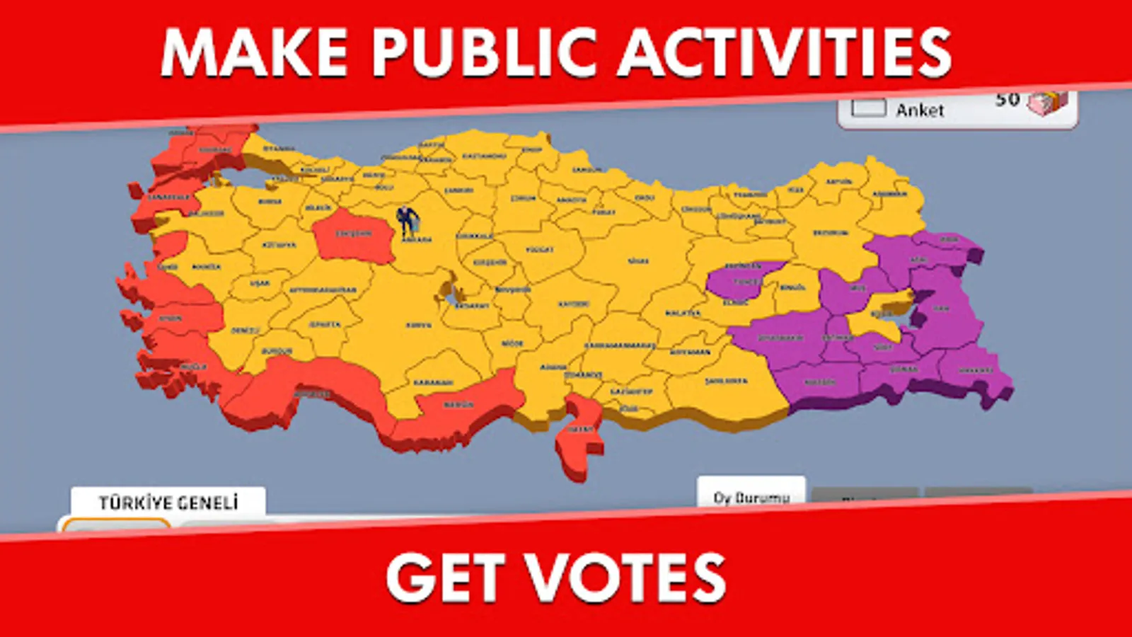 Get ready for the most exciting election game yet! Choose your favorite party or create your own custom party with your own character. Travel across Turkey to attend rallies and events, and make appearances on TV to attract voters and gain their support.