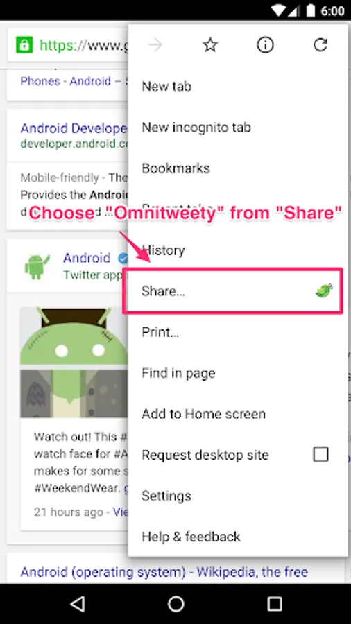 - When you want to share URL to other apps, just select Omnitweety from share feature of the app. Omnitweety will automatically tweet with a predefined template.