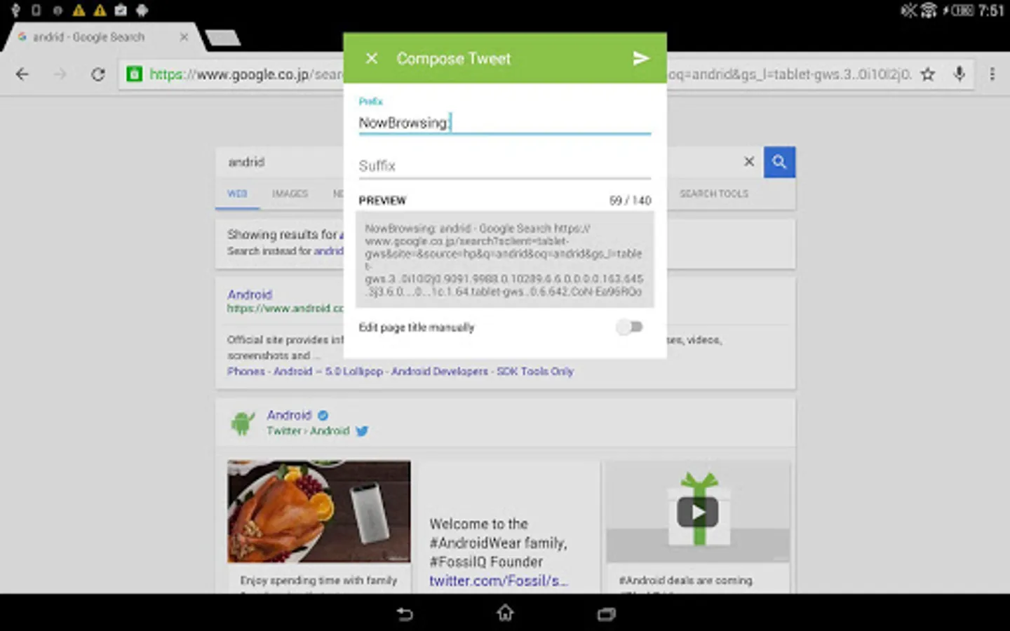 Omnitweety receives share intent from any app, and if it contains a URL, then it tries to fetch its title and then re-share it to the app of your choice.