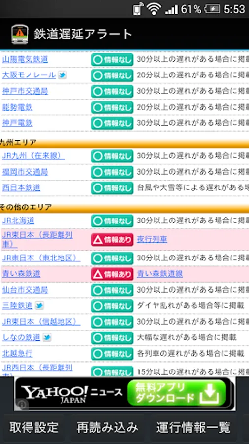 取得する鉄道会社は3つまで指定できます。また、運行情報一覧ページで確認することもできます。