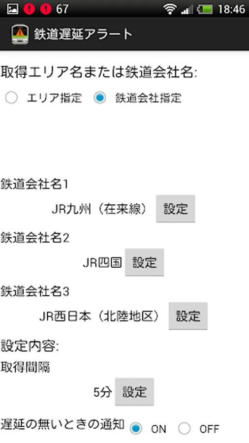 遅延が発生しているときにバイブレーションで通知するかどうかや、遅延がない時にも通知するかどうか、また取得エリアや曜日や時間帯を指定しての取得および更新間隔も細かく設定できます。