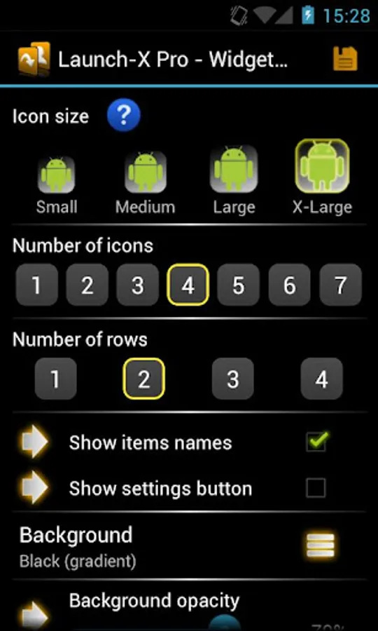 - Background opacity: In Launch-X Pro you can hide the widget background by setting the opacity to 0%. The free version has a minimum opacity of 60%.