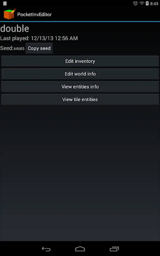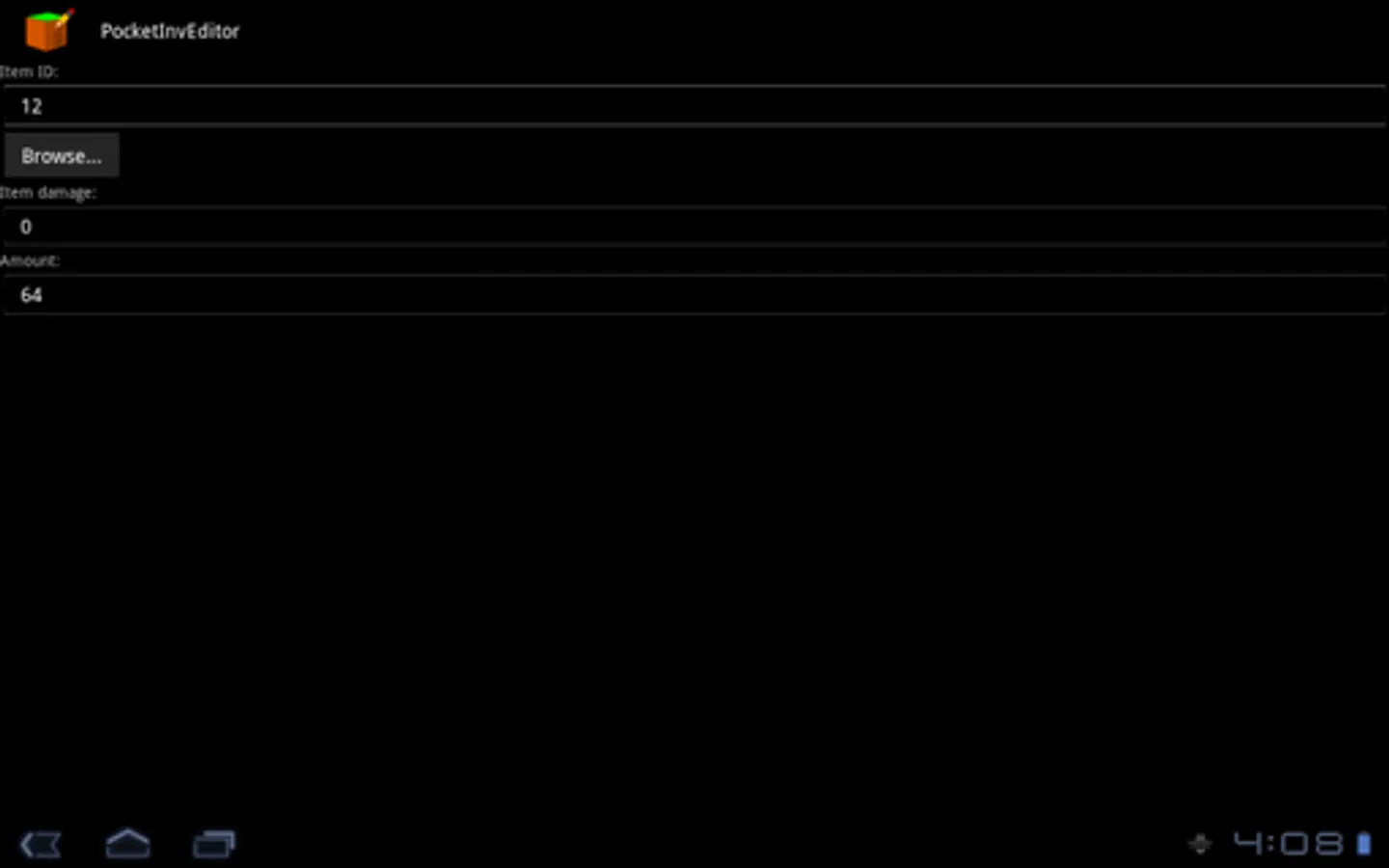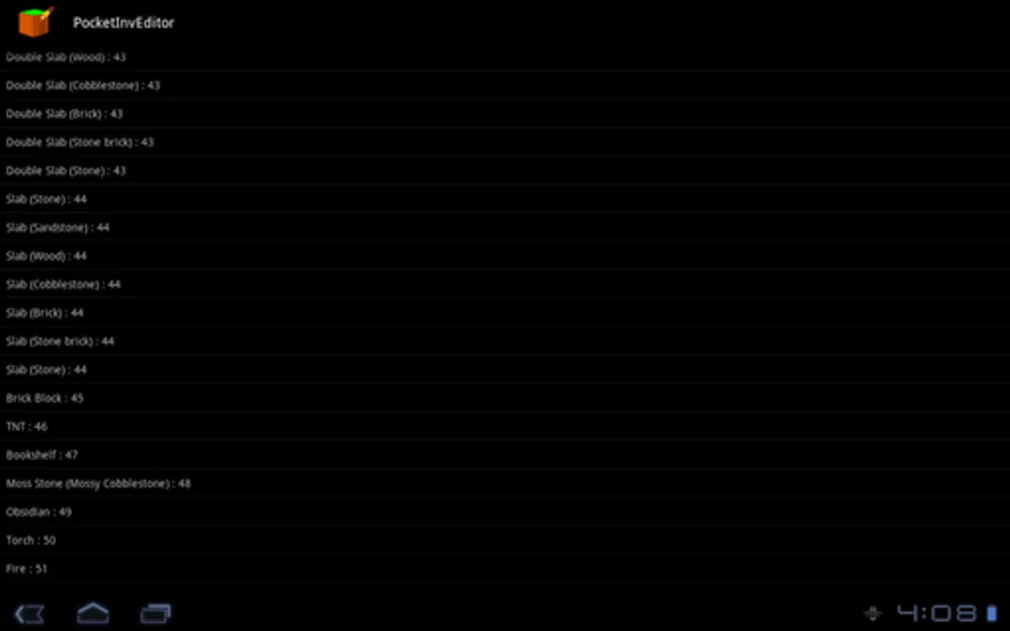 PocketInvEditor is an inventory editor for Minecraft Pocket Edition. With this tool, you can give yourself more blocks and items without writing a single hexadecimal digit or connecting to a computer.