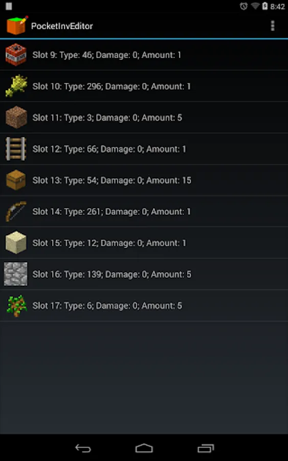 Allows editing of all item slots in Survival mode - edit type id, damage value, and amount!
