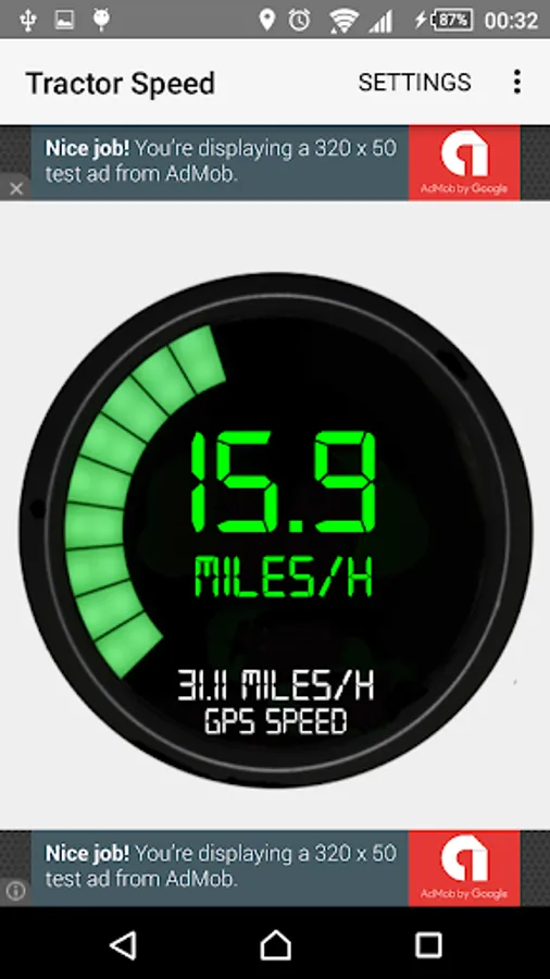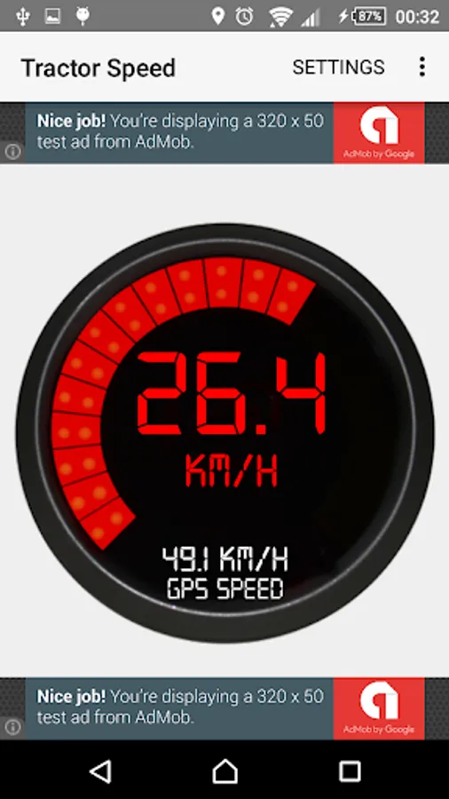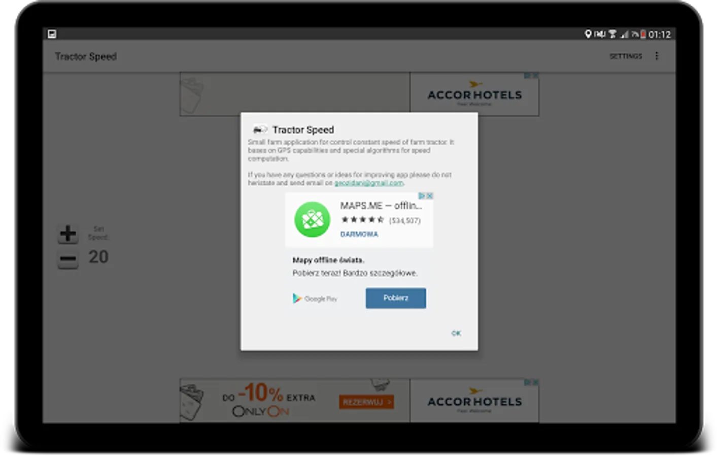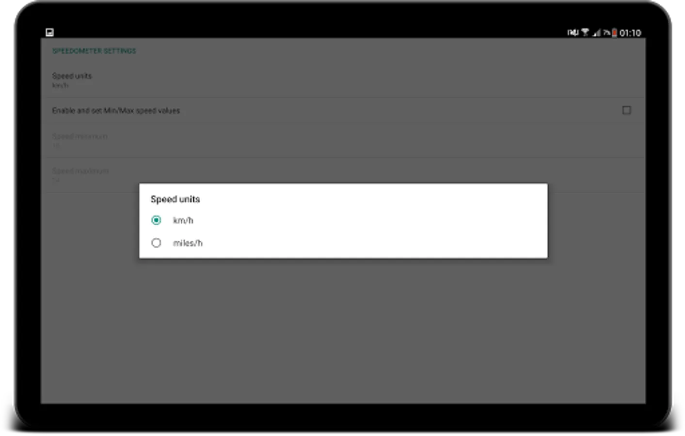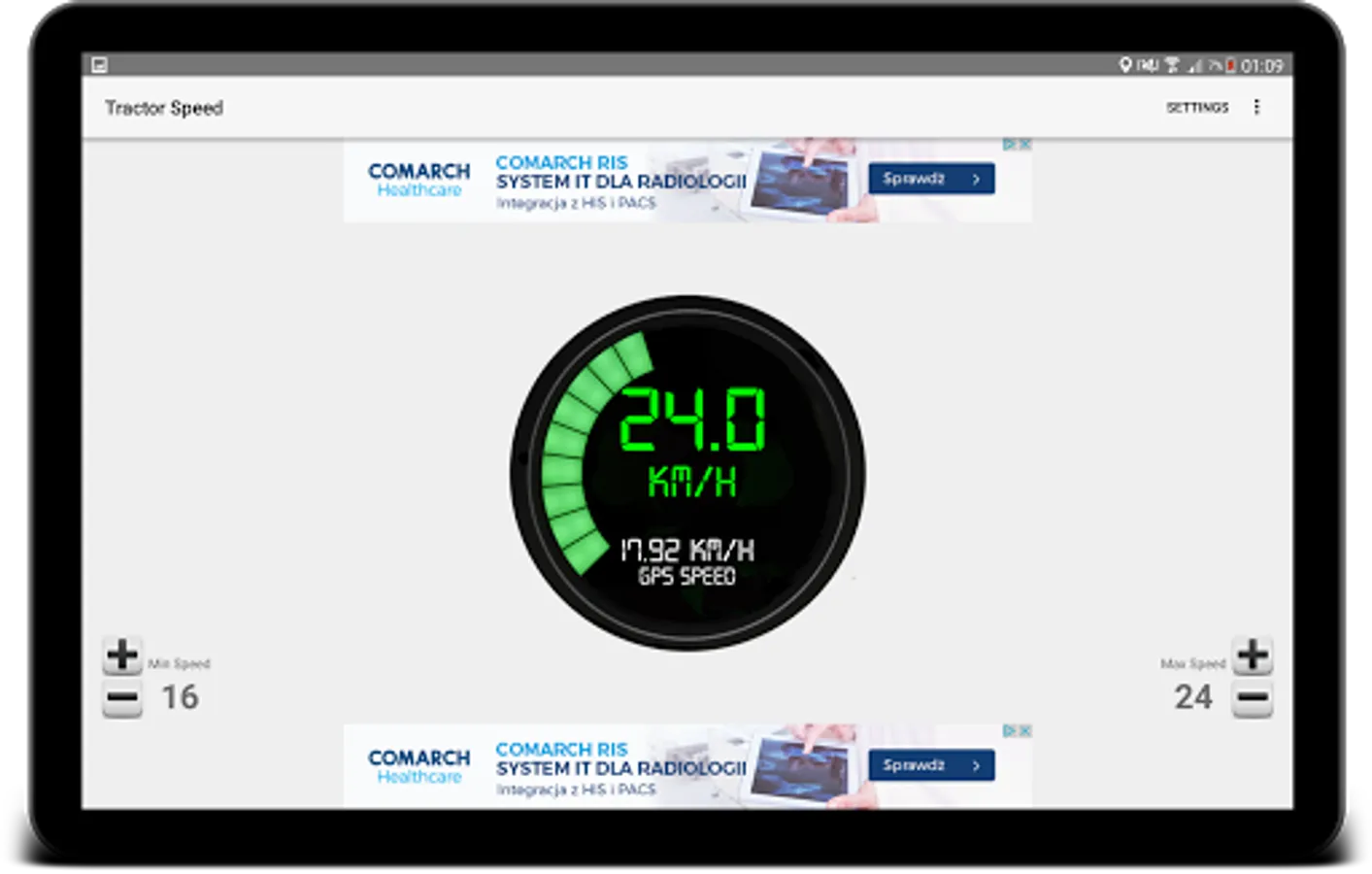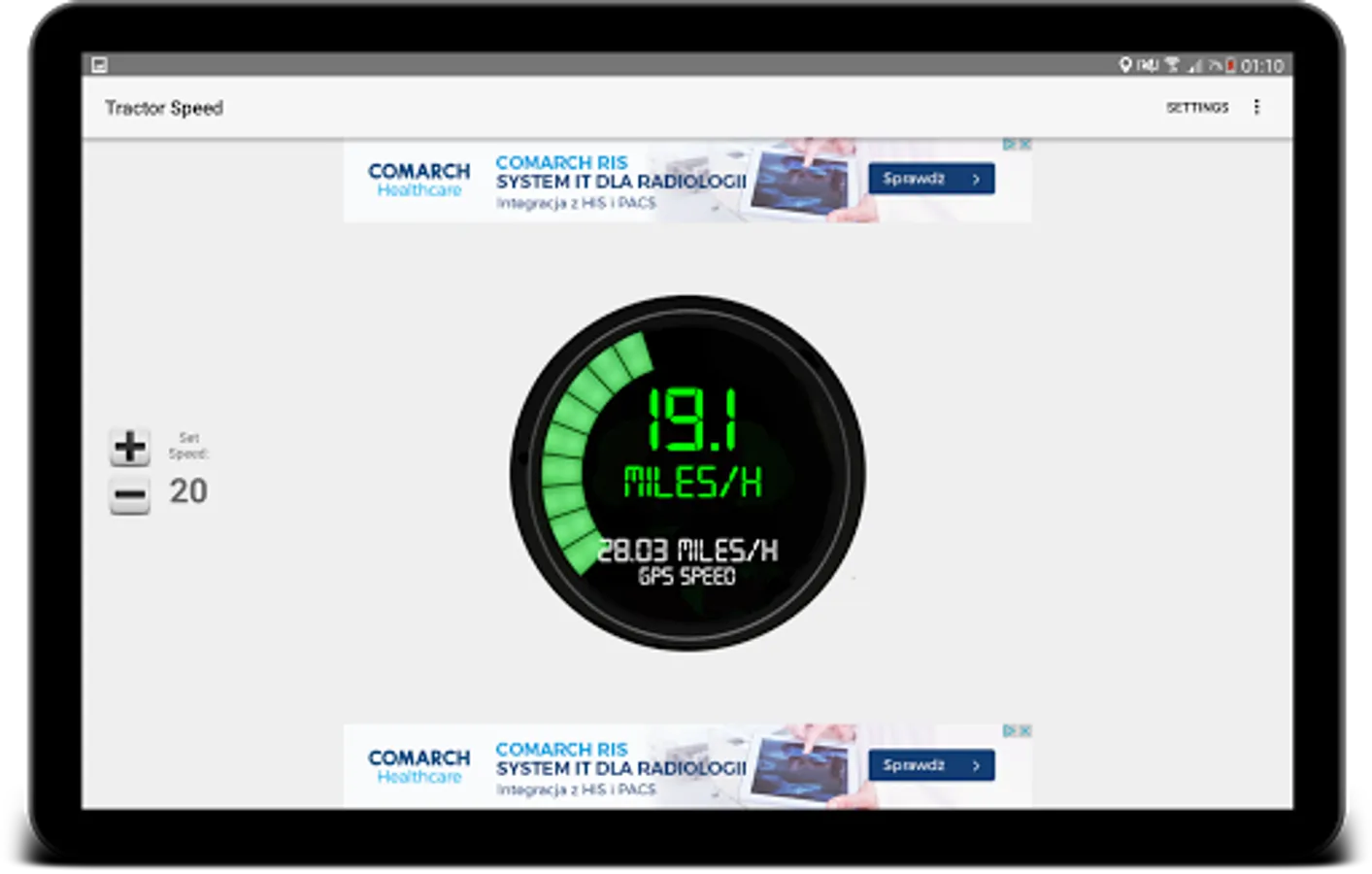 Speedometer is fitted to farm work mainly in case of fields work with constant speed. You can setup a constant speed in settings and you will be warned when speed will be exceed. Speed is displayed as current measurements and as average from last period of time.