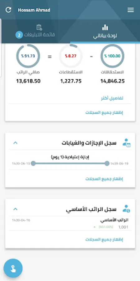 4. لوحات بيانات لعرض أهم المعلومات الخاصة بك (أرصدة الاستحقاقات، قسائم الراتب، سجل الإجازات والغيابات، السجل التدريبي، تقويم الأداء وسجل التغيرات بالراتب الأساسي).