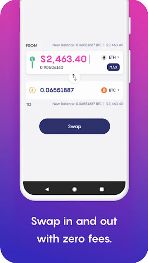 Swap between supported cryptocurrencies and tokens, instantly, easily, and with zero fees. You can use Swap to quickly react to the market, rebalance your portfolio, take profits, and get exposure to new coins.