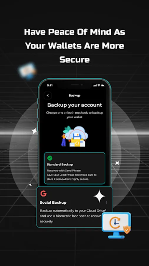 With two private key backup options: Advanced (Social Backup with iCloud or Google Drive) and Standard (private key or seed phrase), you can flexibly choose any backup method suited to your desire.