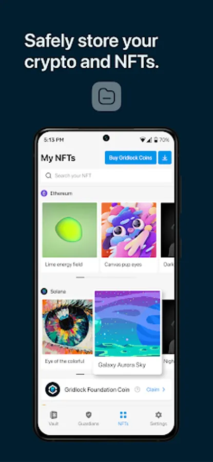 Cryptocurrency has never been easier! Buy and hold popular cryptocurrencies like Ethereum (ETH), Solana (SOL) and Polkadot (DOT), and store your favorite NFTs safely within your self-custody Gridlock Crypto & NFT Wallet. Buy your favorite cryptocurrencies and store them directly in Gridlock – all within a single app. We’re adding coins all the time, so if you don’t find the crypto you want, please let us know and we’ll get to work on it. Make your cryptocurrencies safe!