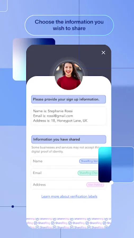 You can choose what information to share with any business or service online or offline. The app allows users to share singular pieces of verified information. You own your data and have complete control over what you wish to share and with whom. We believe the privacy and security of data is an absolute priority. We promise total control and data privacy to our users and can provide businesses with guaranteed high degrees of trust that documents have not been edited or tampered with.