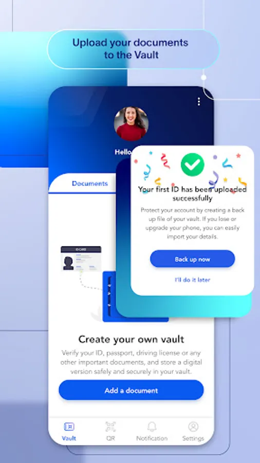 You can securely store personal information in your vault, such as passport details, national ID, driving license, proof of address etc. Any information added to the vault is verified with our technology and encrypted, so only you can unlock and view this information. You can manage your information in the vault on your mobile device. Your encrypted data is stored on your mobile's internal storage, never on any cloud server or central database.
