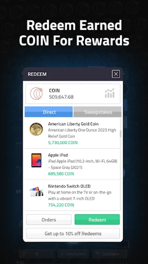 Earn digital currency and physical products for Geomining your local area. COIN has a variety of redeem options, and we're always adding more! You can redeem digital currency, iPads, Bluetooth speakers, and even gaming systems!