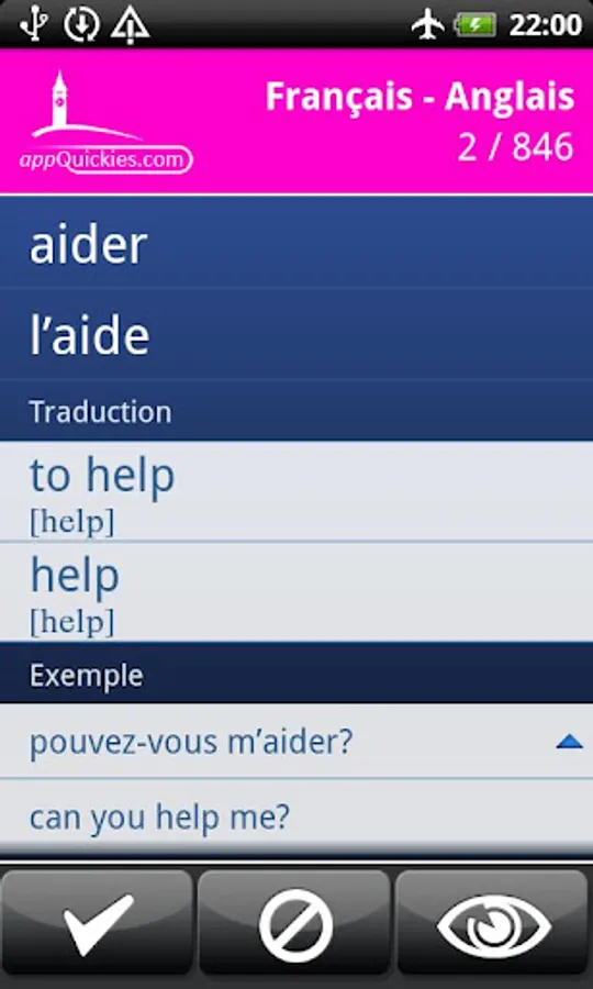 Subsequently, a French or English word and one or more example sentences appear. If you press the button, the solution appears. Phonetic writing is indicated with each keyword. You can recall explanations for the phonetic symbols in the "Help" menu.