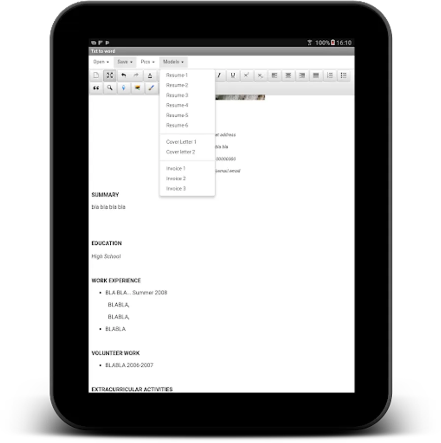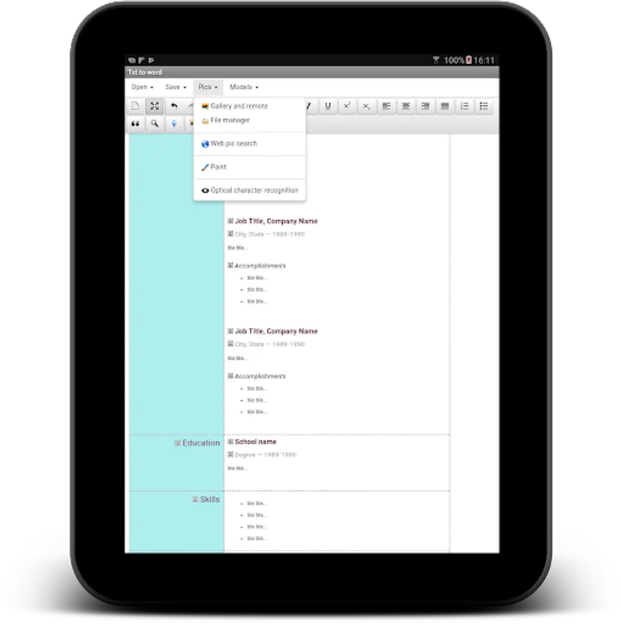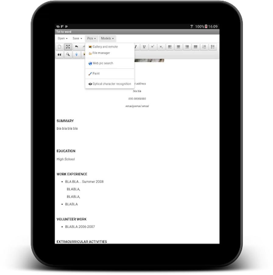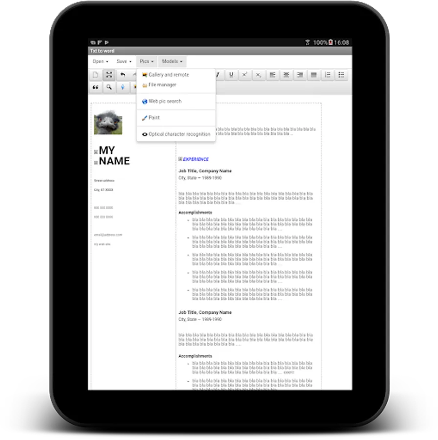Create or modify DOC , DOCX , RTF , ODT , HTML , TXT.Documents manipulation, change styles font and colors, insert pictures , optical character recognition and PDF converter. Resumes ,invoices and cover letters templates availables. Sign your documents using paint option.