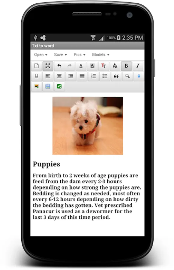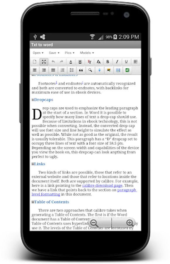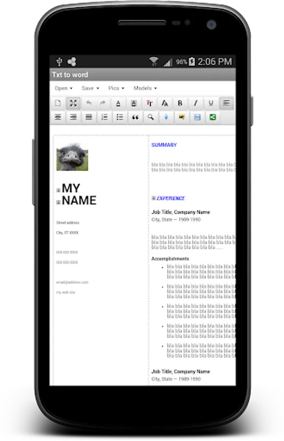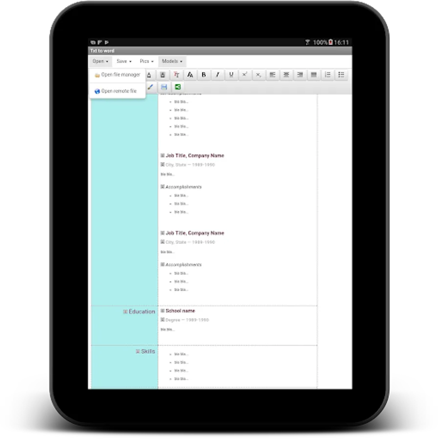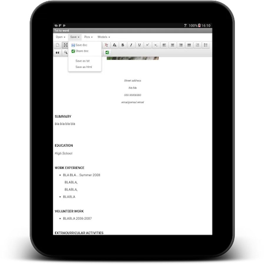 Create or modify DOC , DOCX , RTF , ODT , HTML , TXT.Documents manipulation, change styles font and colors, insert pictures , optical character recognition and PDF converter. Resumes ,invoices and cover letters templates availables. Sign your documents using paint option.