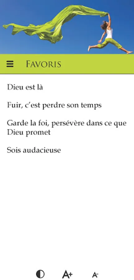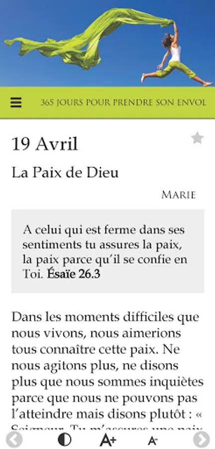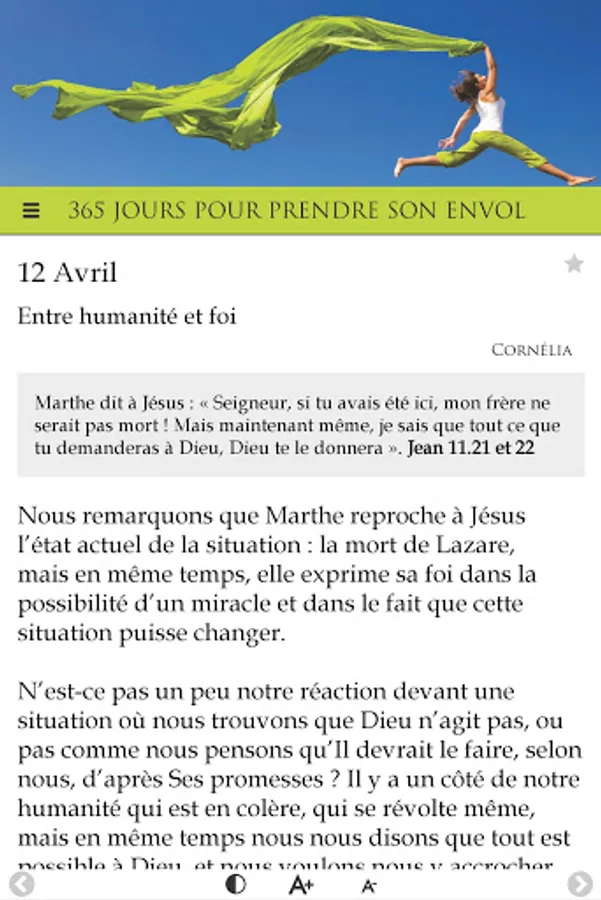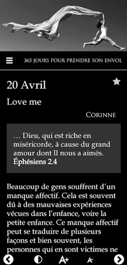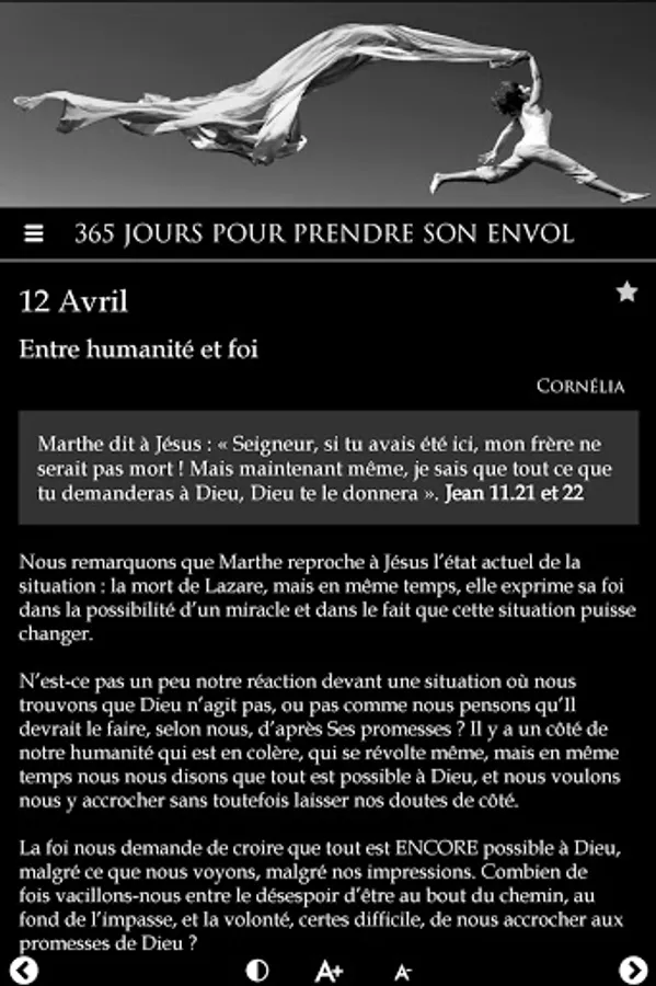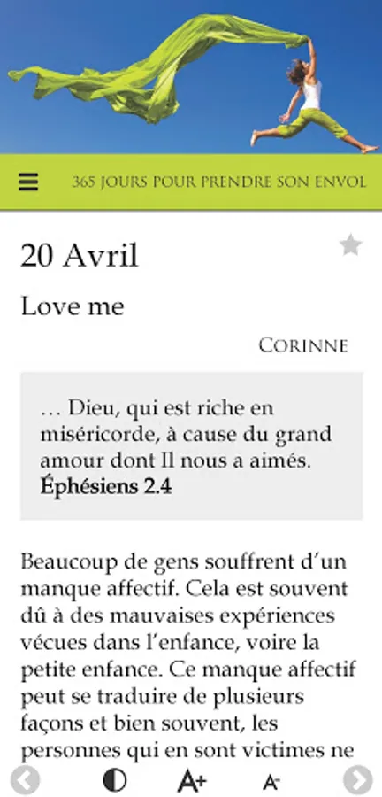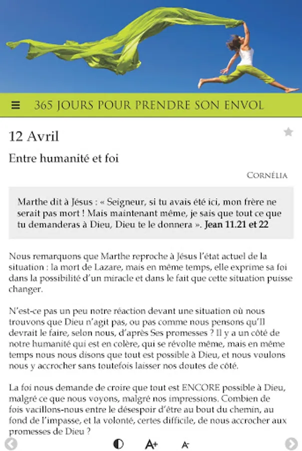 In the same vein as "365 days to rekindle the flame", this application offers 365 days of meditation, daily encouragement, centered on the Word of God, to help women grow in faith as well as in their relationship with God, to realize their value in God, to enter into why they were born and finally, to take flight.
