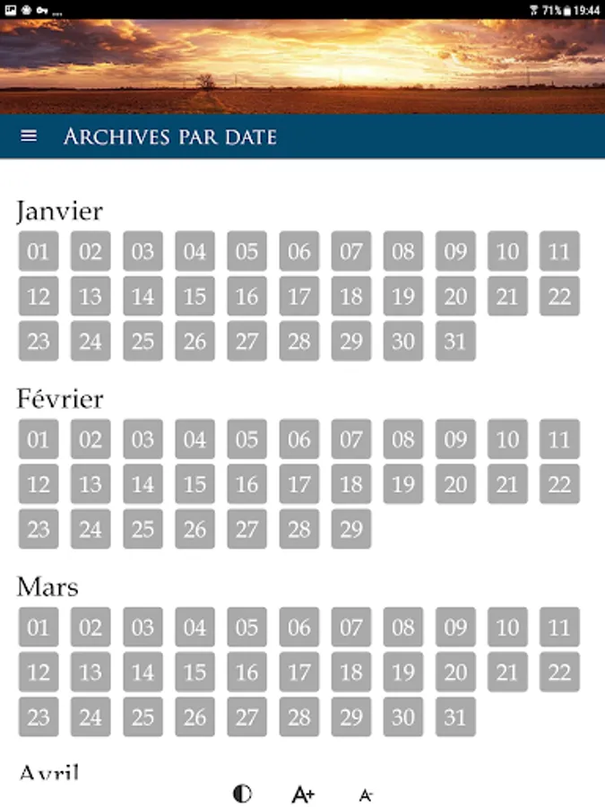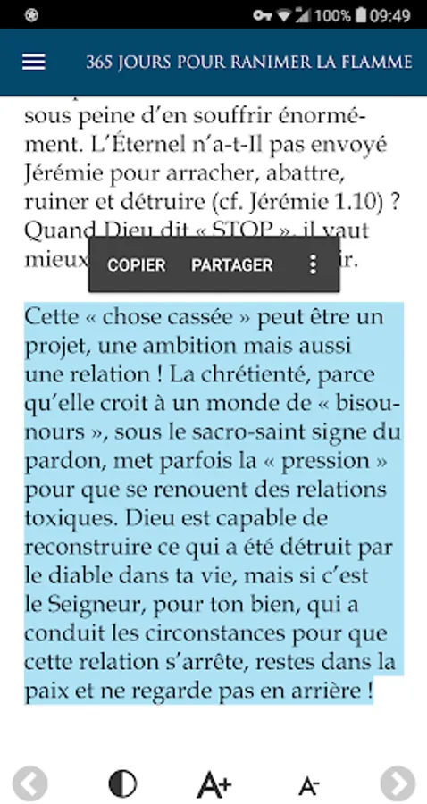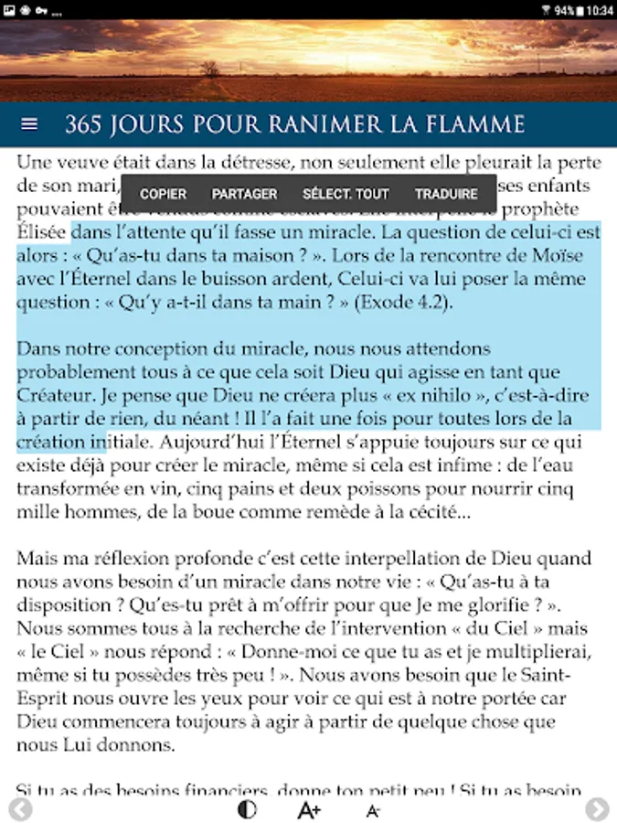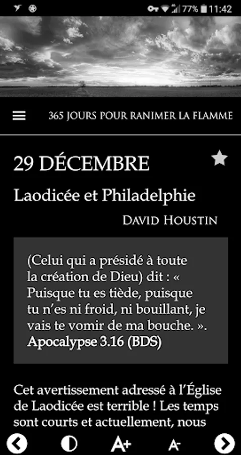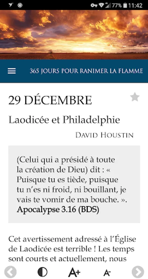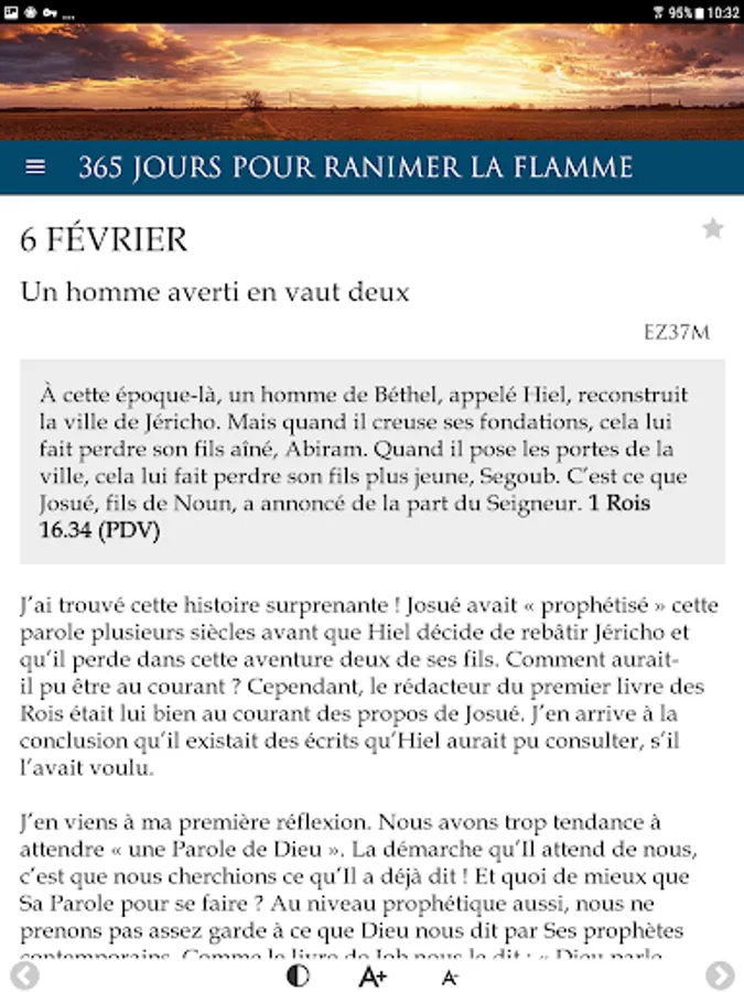 In the same vein as "The Treasures of Faith" by Charles Spurgeon, "All for Him to Reign" by Oswald Chambers or even "The Good Seed", this application offering 365 days of devotion will help you read and meditate on the Bible, from Genesis to Revelation.