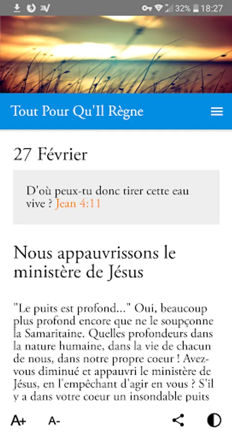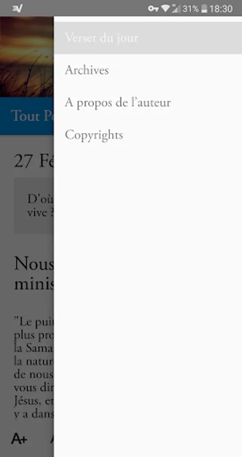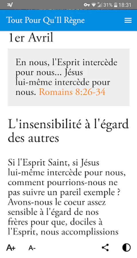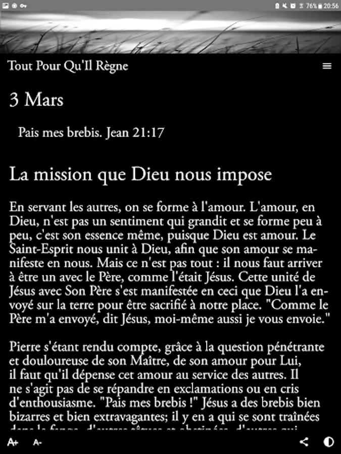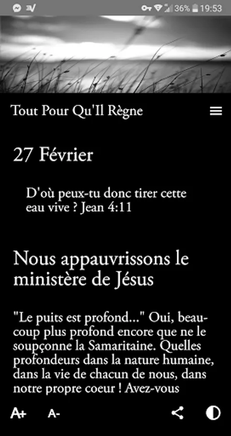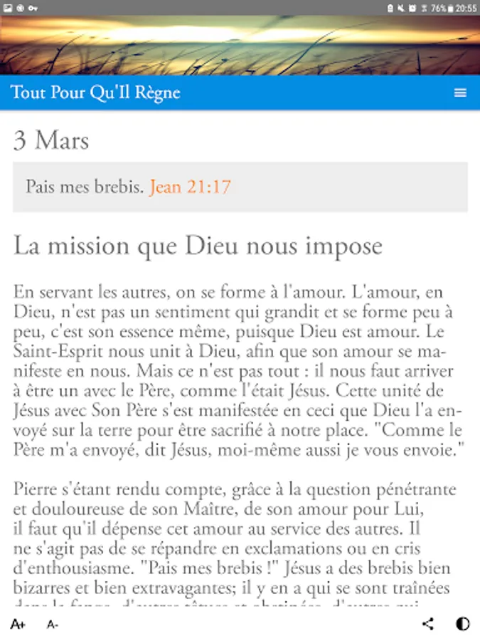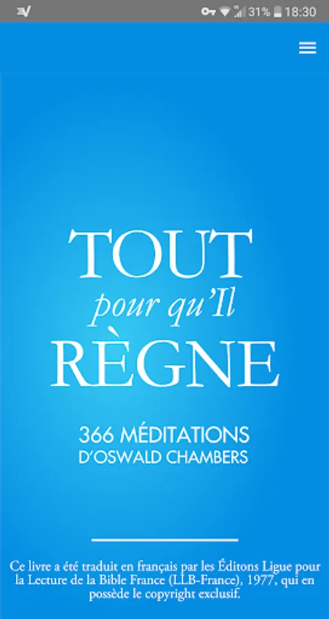 ✔ This Christian application, accompanied by a widget, allows you to find this collection in electronic and dynamic format. Each meditation can be viewed via the archives page while the biblical thought of the day is automatically displayed at the opening.