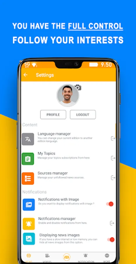 You have the full control, using settings, you can customize sources you want to follow, customize breaking news notifications, follow your favorite topics and interests.