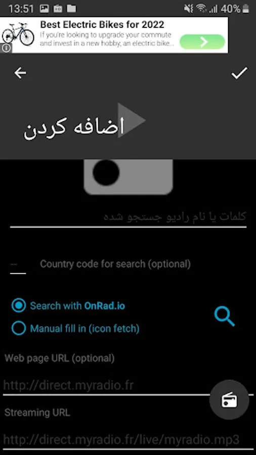 ● Go to the add screen, fill in the radio details and get the icon or search using the free onrad.io radio database and you're done!