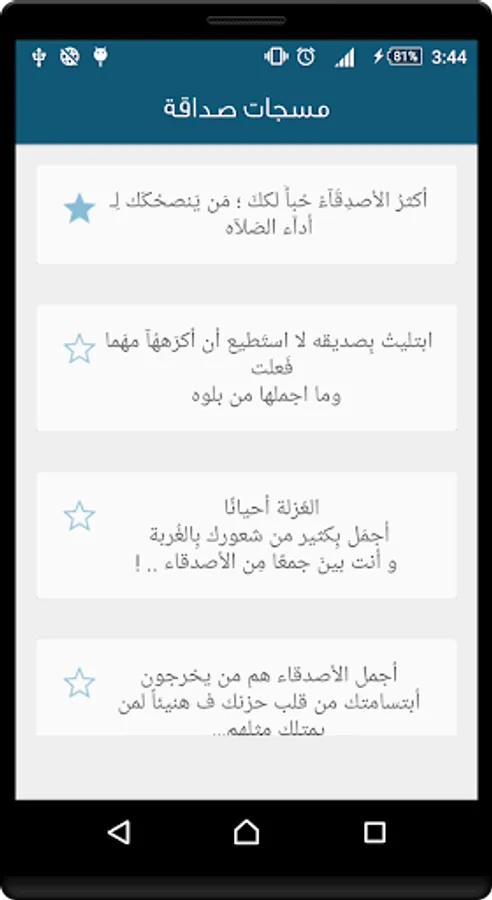 يحتوي تطبيق أجمل الرسائل للاصدقاء على رسائل منوعة في الصداقة، يمكنك التطبيق بخصائصه الفريدة وادواته سهلة والبسيطة والتي تستطيع من خلالها مشاركة الرسائل بين جميع اصدقائك على مواقع وتطبيقات شبكات التواصل الاجتماعي .