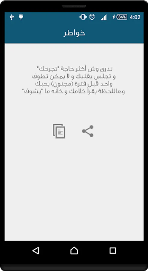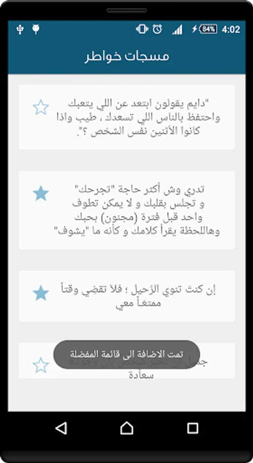 تطبيق خواطر يحتوي على مجموعة من الخواطر والكلمات التي تحمل الذوق الرفيع وتستطيع مشاركتها على الفيس بوك والتويتر الجيميل والواتس اب ،