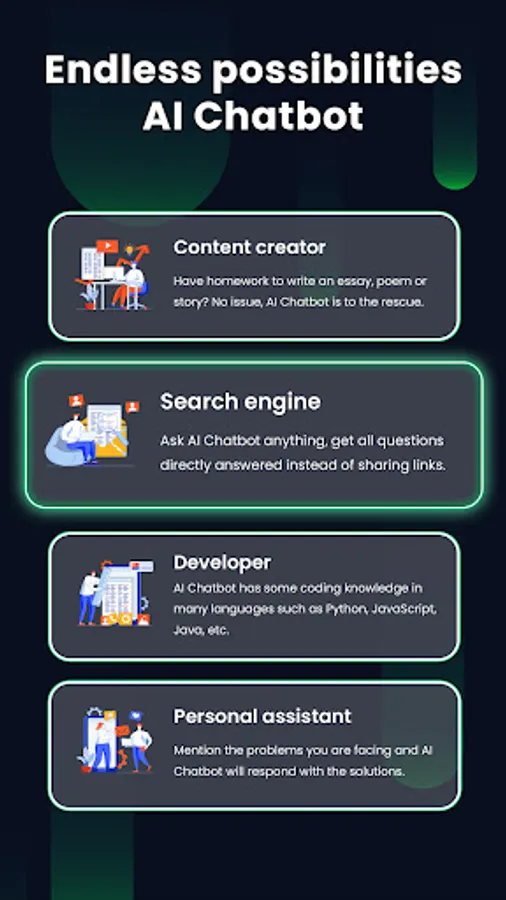 This mobile app is the perfect solution for anyone who values intelligence and convenience. Whether you're looking for information, advice, or just want to have a conversation, the AI chatbot powered by GPT-3 & GPT-3.5 & GPT-4 technology will provide you with smart, relevant answers that will leave you impressed and satisfied. So, why wait? Download the app today and start chatting with the smartest AI chatbot on the market!