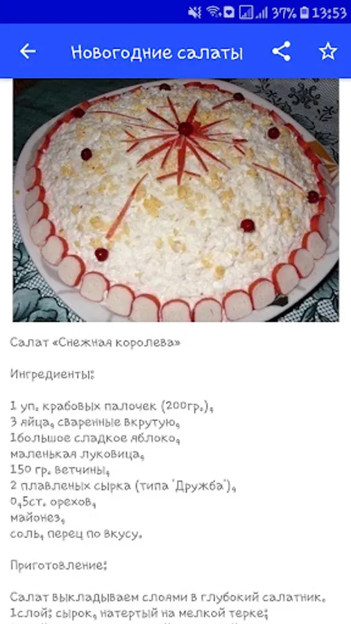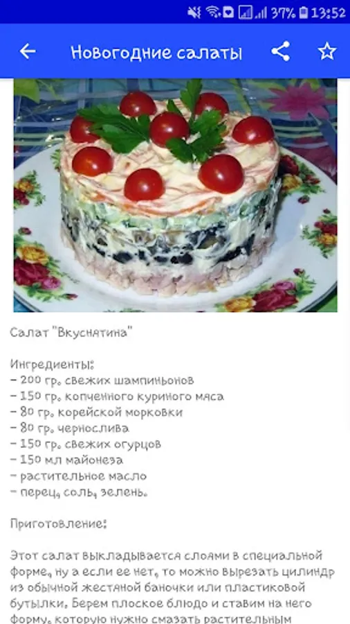 In the application of Recipes for delicious salads 2020 you will find vegetable and fruit salads, diet salads, salads with meat, chicken, seafood, as well as exotic recipes.