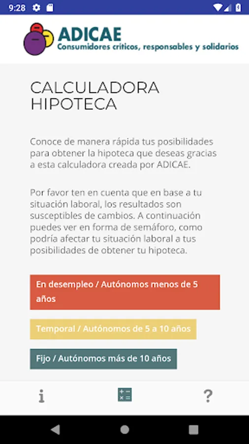 It is a very simple calculator to use, where you will only need to enter your income, expenses, initial investment available and the value of the mortgage. The App will guide you on your real possibilities for the approval of the mortgage.