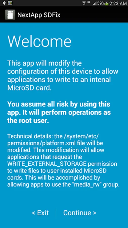 NextApp SDFix will modify the configuration file located at /system/etc/permissions/platform.xml to allow apps to write to the MicroSD card. Specifically, SDFix will add the Android UNIX group "media_rw" to the WRITE_EXTERNAL_STORAGE permission's configuration. This will enable apps (only those that you granted write access permissions to when you installed them) to write files to the MicroSD card. On many devices, this is effectively reverting the state of this permission back to the way it was configured in Android 4.3. This modification is carried out by modifying the existing XML file, rather than replacing it.