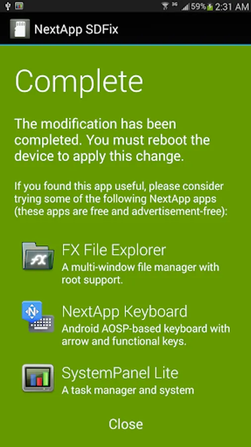This app is free and has no advertisements (with the exception of links to other NextApp apps when it completes its task).