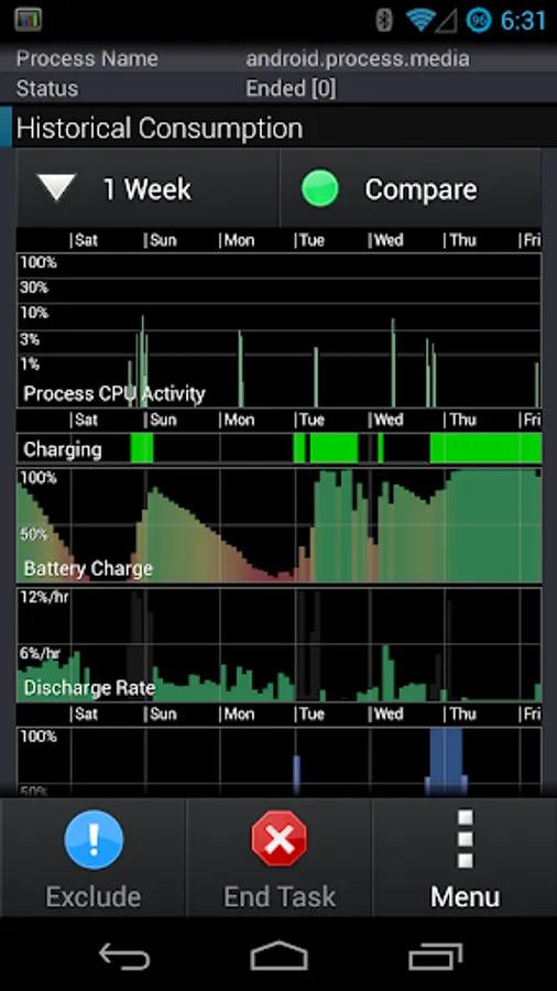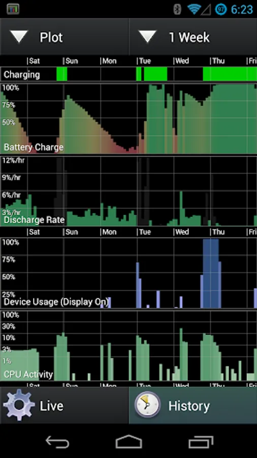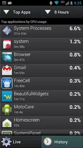 System Monitor: The system monitor can be enabled to record device usage history over a period of time (up to one week), such that you can determine what applications and usage patterns have the greatest impact on battery life. This feature is commonly used to help track down which applications are having major negative effects on battery life. The system monitor records CPU usage for each process, overall CPU usage, display usage, battery level, and battery charging status.