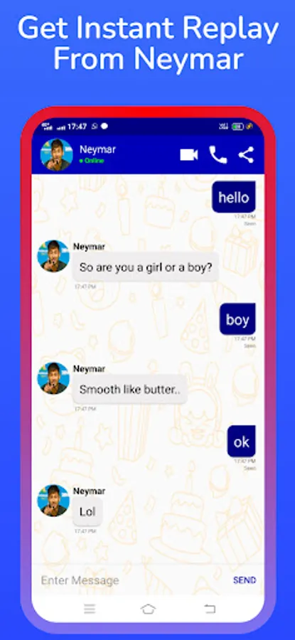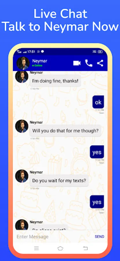 Download this Neymar Fake Chat & Video Call Game app and prank your friends by making Neymar live video call like a real. Even you can screenshot during video call, Audio Call and Live Chatting, then share them on your social media.
