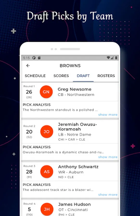 ✓ NFL Draft picks by a team for upcoming NFL Season.