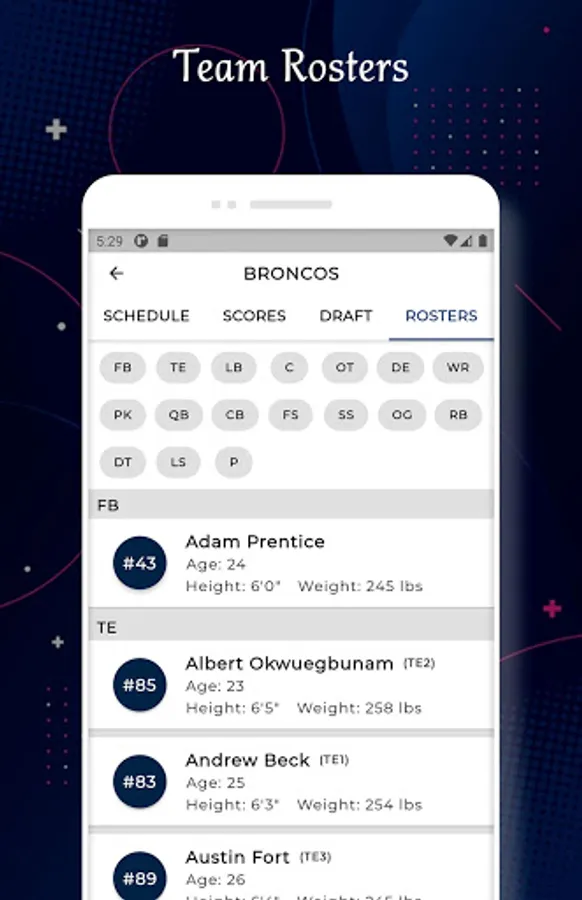 ✓ Team Roster with Offense, Defense, and Special team labels.