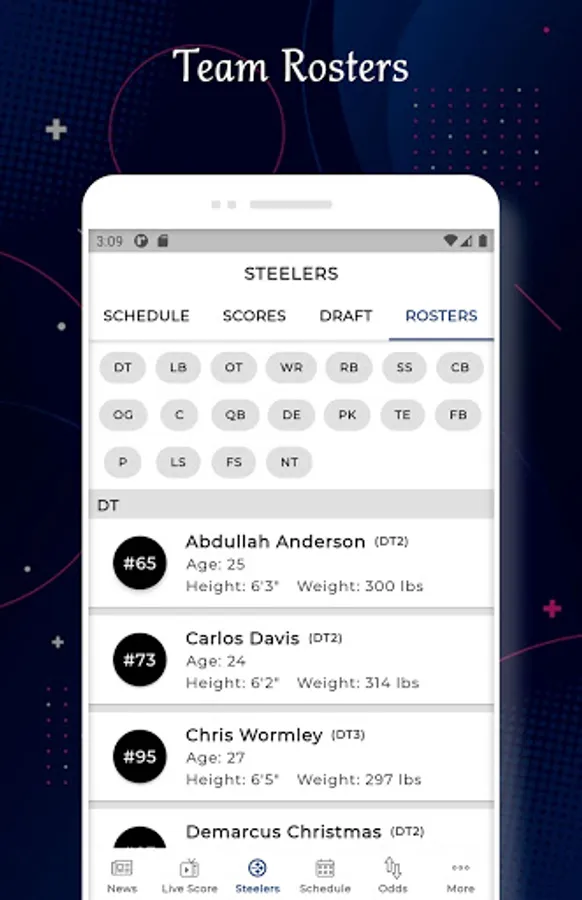 ✓ Team Roster with Offense, Defense, and Special team labels.