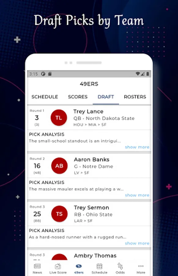 ✓ NFL Draft picks by a team for upcoming NFL Season.