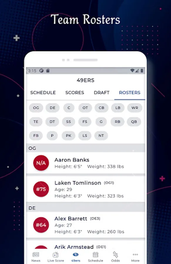 ✓ Team Roster with Offense, Defense, and Special team labels.