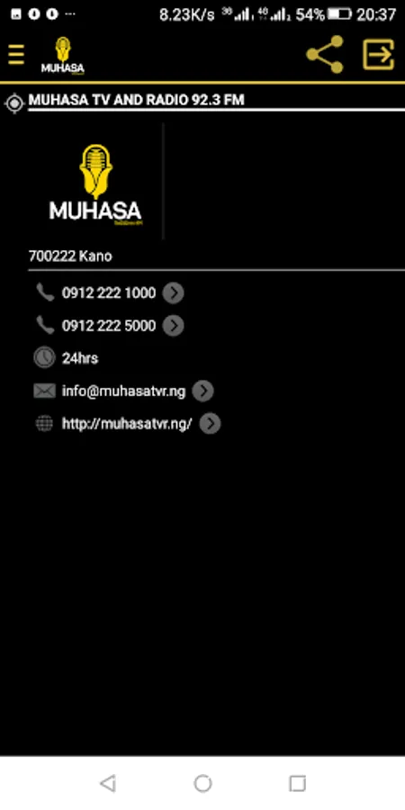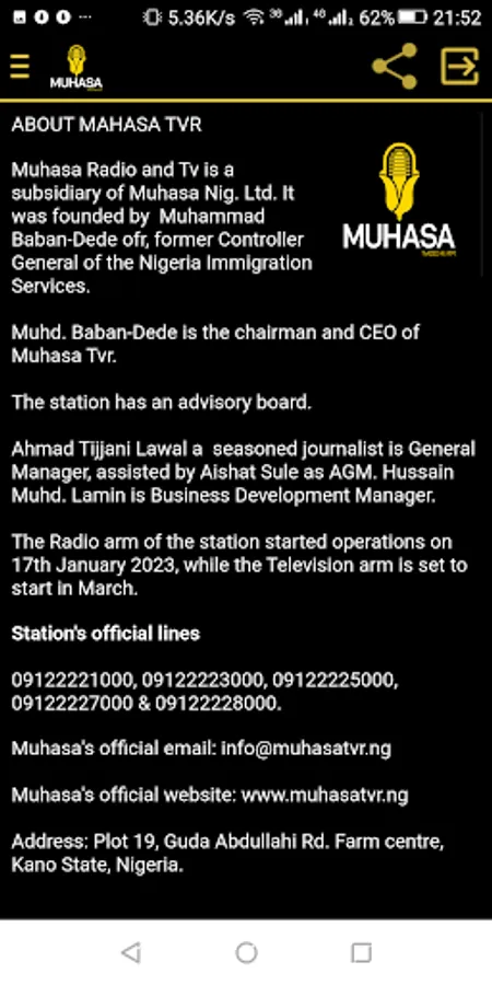 Muhasa Radio and Tv is a subsidiary of Muhasa Nig. Ltd. It was founded by Muhammad Baban-Dede ofr, former Controller General of the Nigeria Immigration Services. Muhd. Baban-Dede is the chairman and CEO of Muhasa Tvr.