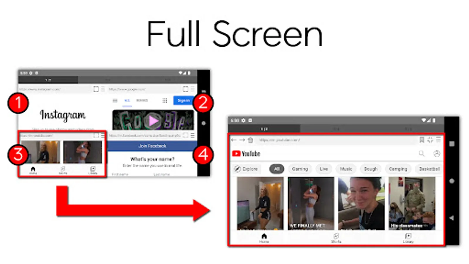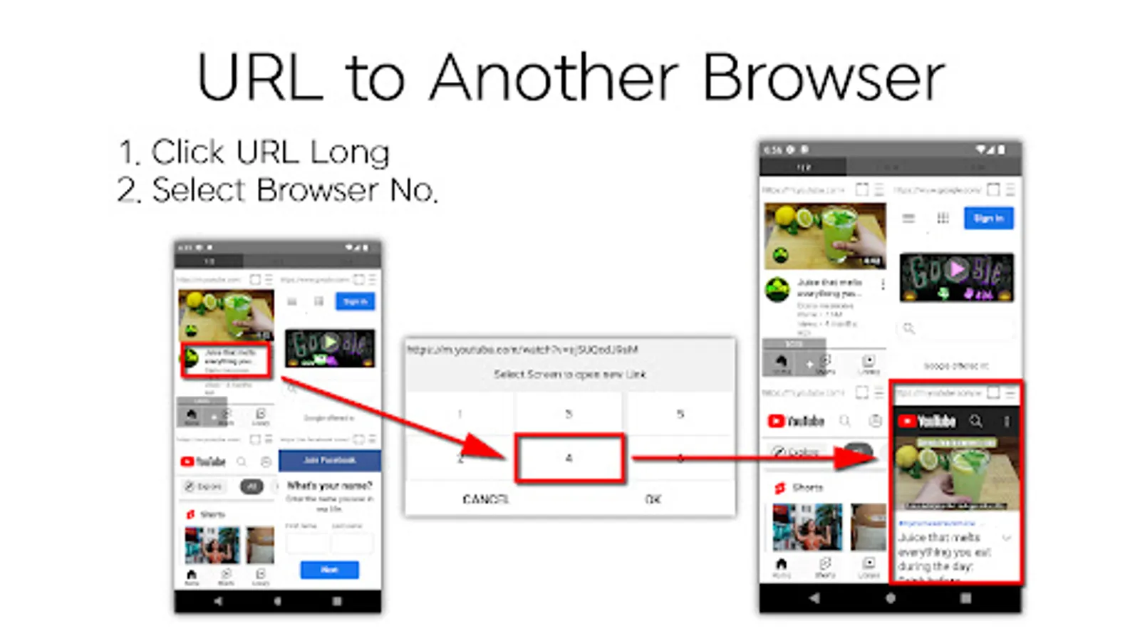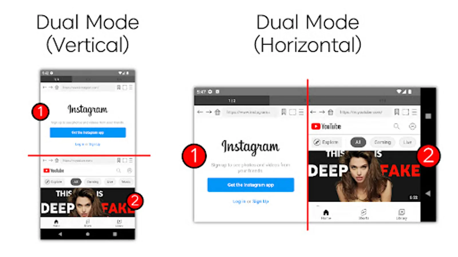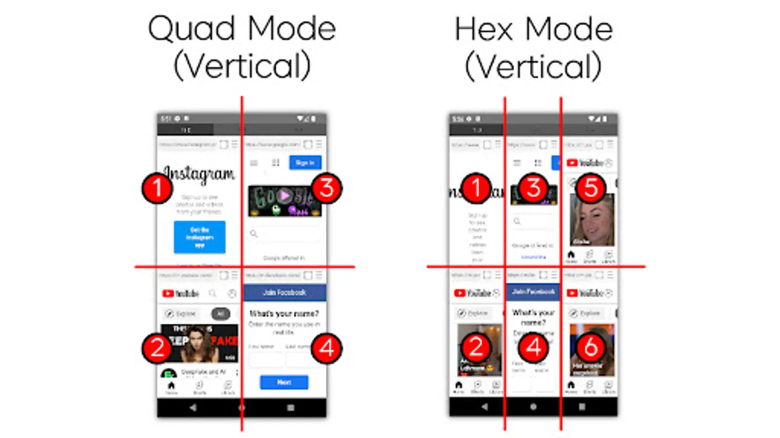 You can use 2 Browsers (Dual mode) or 4 Browsers (Quad mode) 6 Browsers (Hex Mode) in one screen.