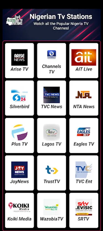 Nigeria Live Station is an exclusive app which provides the smooth and stable HD live streaming of all Nigeria local TV channels (stations) and few. The app allows you to stream from different servers to make sure you don't miss out in-case one fails.