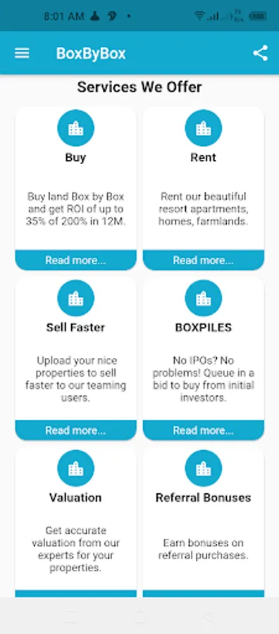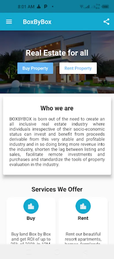 BoxByBox real estate company uses innovative business solutions to lower the financial entry point into the real estate industry. By applying unit disaggregation, users are able buy micro units of properties called sublots with as little as #1000 and watch the value of their investments grow!