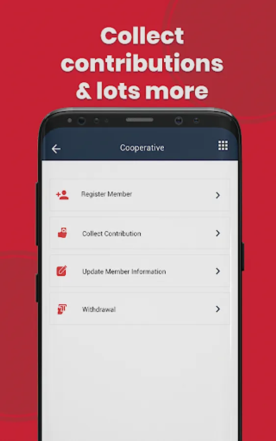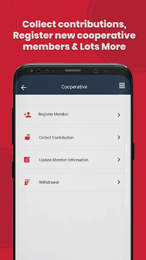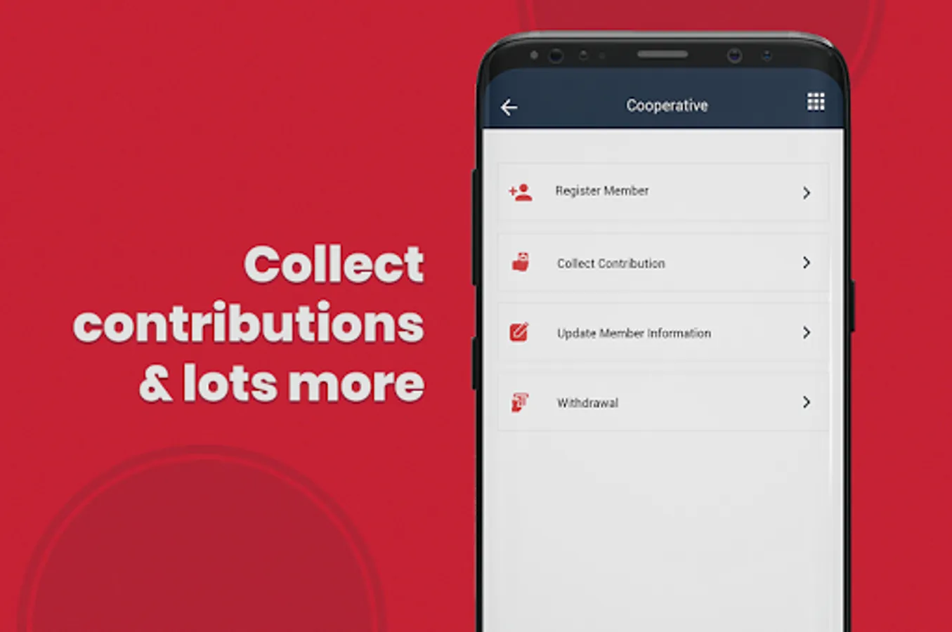 A Cooperative Agent will have the tool to carry out Cooperative management service (register members, collect savings, issue loans, and collect repayment) and Banking services (cash withdrawal and transfer, bills payment) and more.