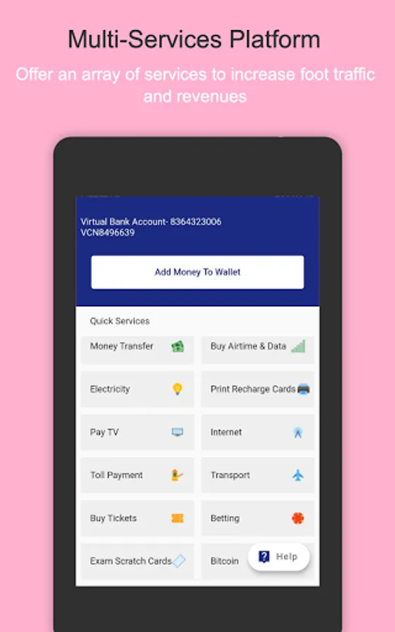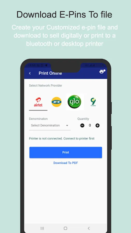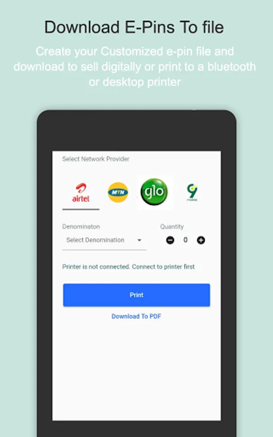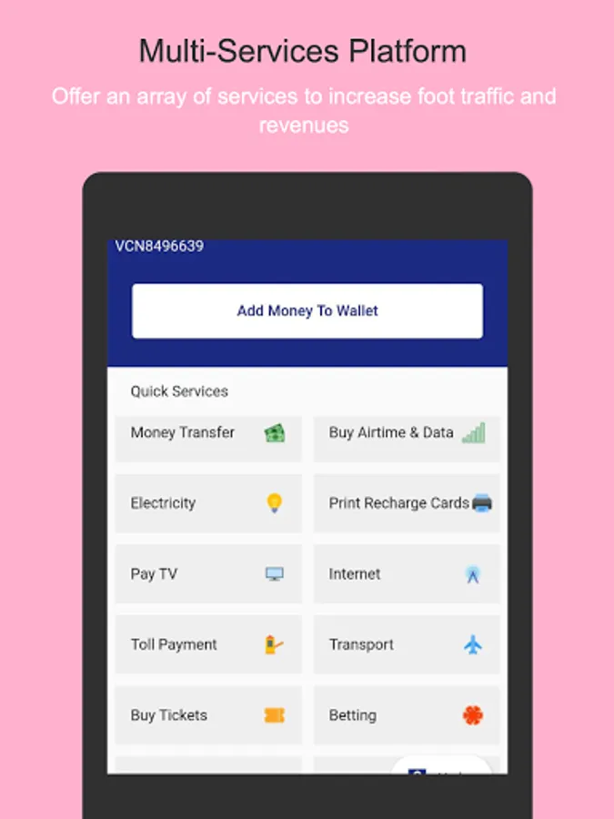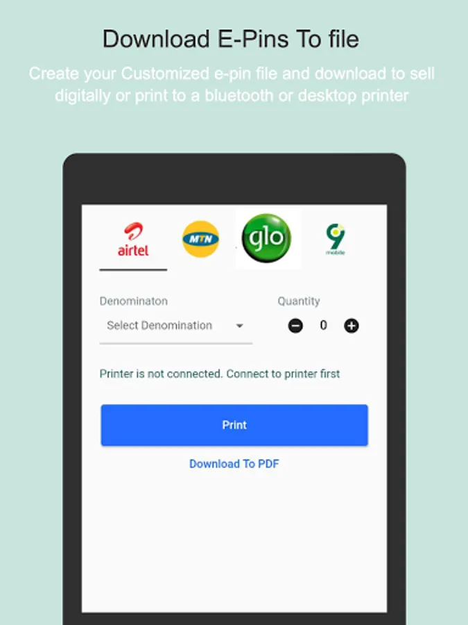 Earn money selling recharge cards or etop-up and collecting cash for bill payment and money transfer. Connect to a bluetooth printer and print recharge vouchers and receipts