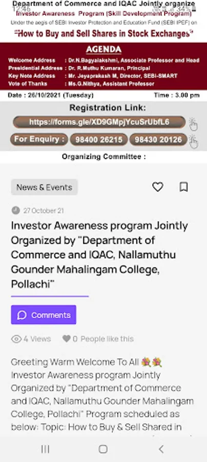 Our Institution has been awarded with ISO 9001:2000 Certification by the TUV. The NAAC has awarded ‘A’ grade in March, 2007. Nallamuthu Gounder Mahalingam College is one of the oldest Colleges in Tamil Nadu which celebrated its Golden Jubilee with traditional fervour and enthusiasm in July 2007.