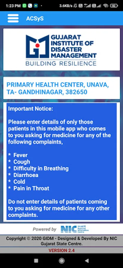 ACSyS: Advanced COVID-19 Syndromic Surveillance System is a concept conceived by Gujarat Institute of Disaster Management and designed and developed by NIC, Gujarat State Centre, Gandhinagar District Collector Office, and FDCA Gujarat State for timely tracing and tracking of suspect cases of COVID-19 to effectively contain its spread in the communities. The system tracks the OTC drug consumption and clinical cases for suspected ILI or COVID-19 like symptoms. The system is having both mobile and web applications. The onboarded drugstores and private doctors are mandated by the district administration for reporting diligently the patients who are taking medicines for the 6 identified symptoms (Fever, Cough, Difficulty in Breathing, Diarrhoea, Cold, and Throat Pain). The reported data is available for the concerned Government Doctors to alert his field health workers to do a home visit and check the vitals and symptoms and take necessary intervention like recommending further testing, hospitalization, etc., The system is managed by District Surveillance Officers of the concerned districts.