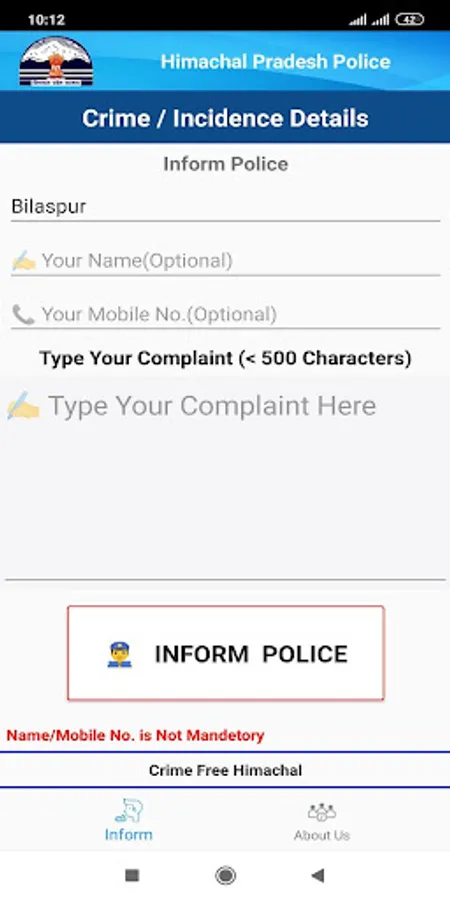 The Crime Free Himachal Mobile app provides facility to citizens to report any kind of Crime to the Himachal Pradesh Police.