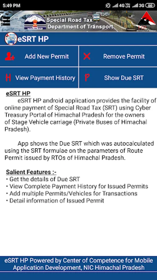 eSRT HP android application provides the facility to calculate payment of Special Road Tax (SRT) for the owners of Stage Vehicle carriage (Private Buses of Himachal Pradesh).